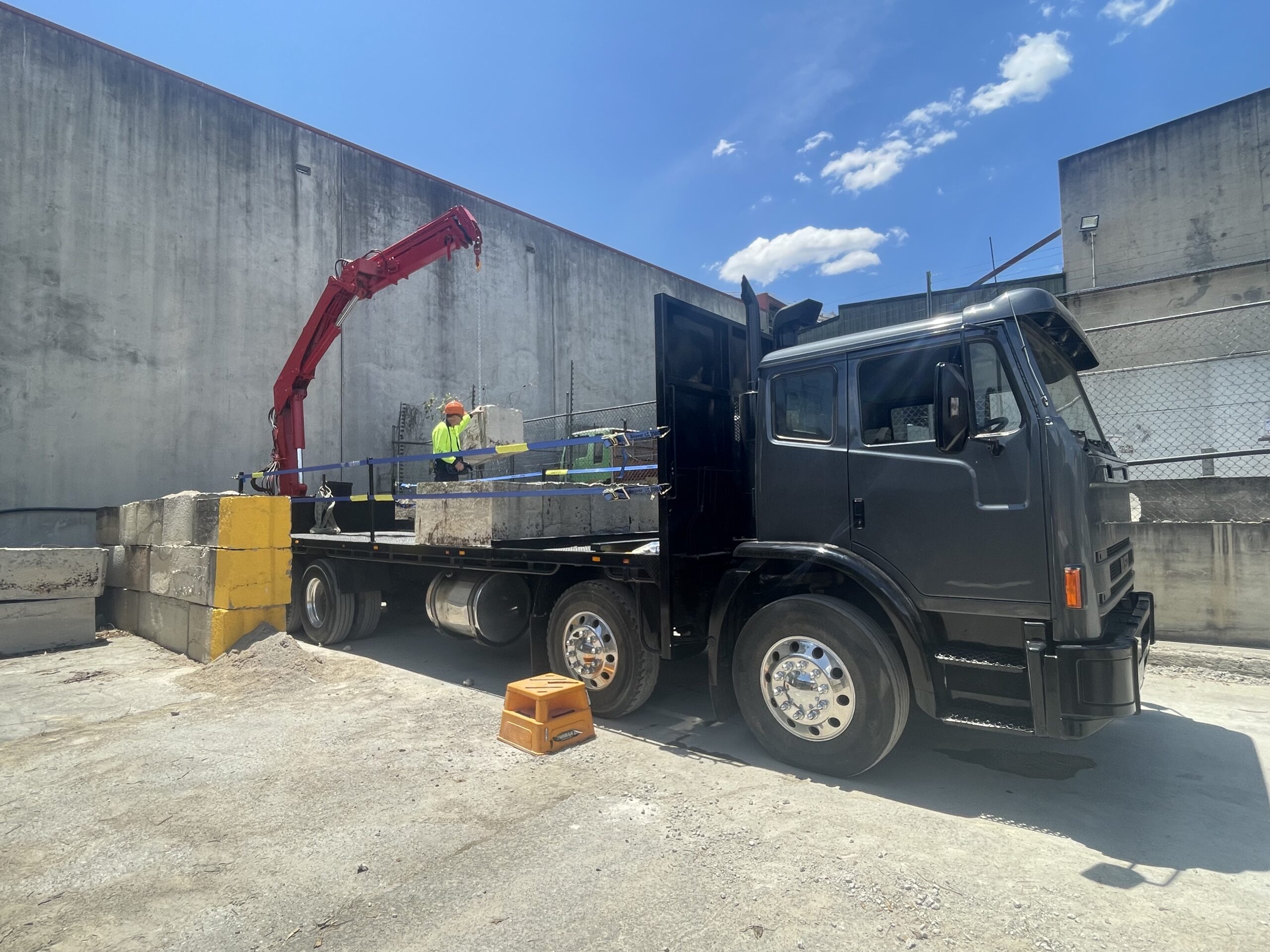 We use our rigid Hiab truck to deliver our blocks. This truck whilst being a rigid still requires decent access. We can carry up to 15 blocks depending on the style and location of delivery. We are also able to unload with our crane and even help construct walls and bays as well.