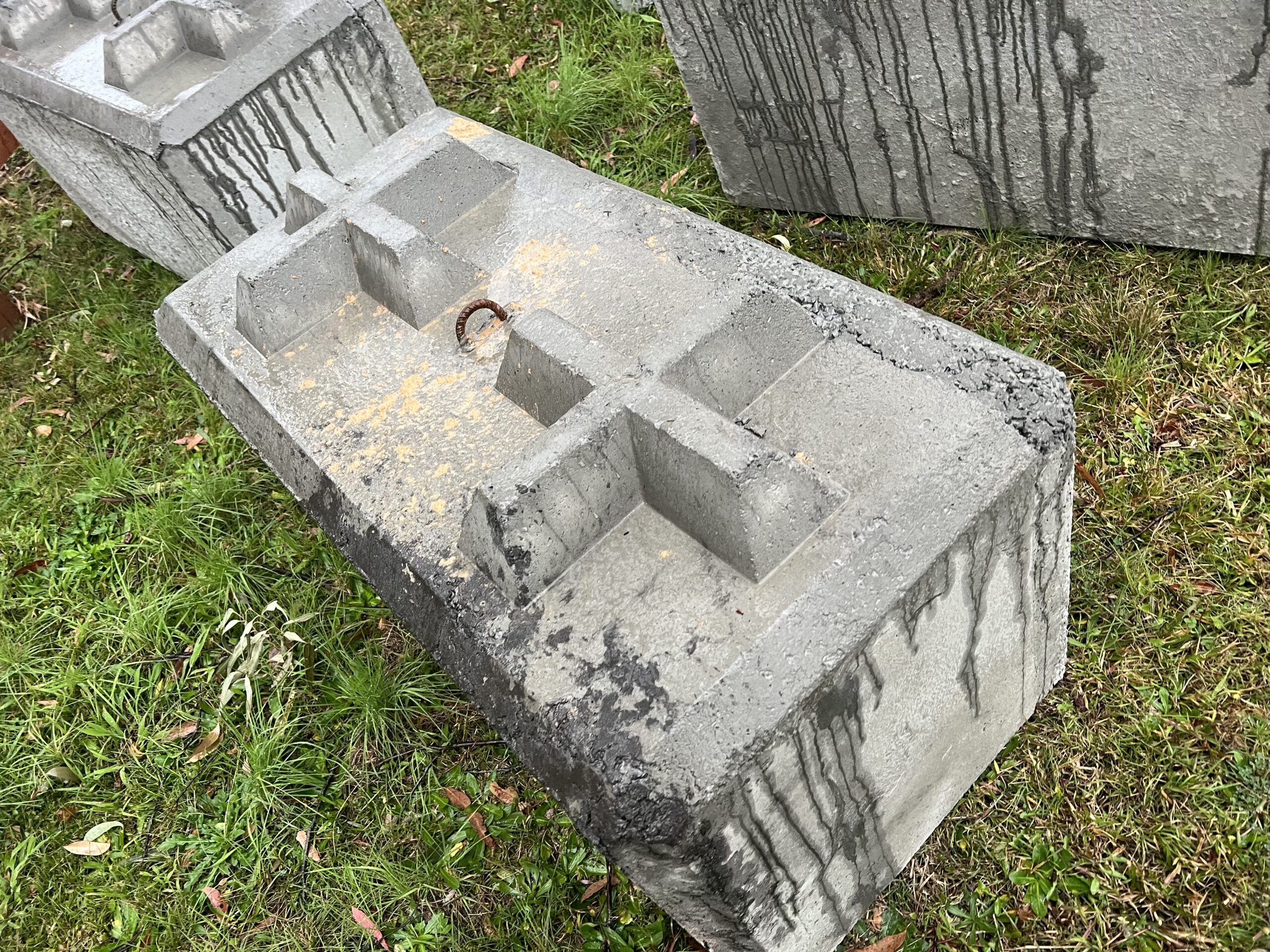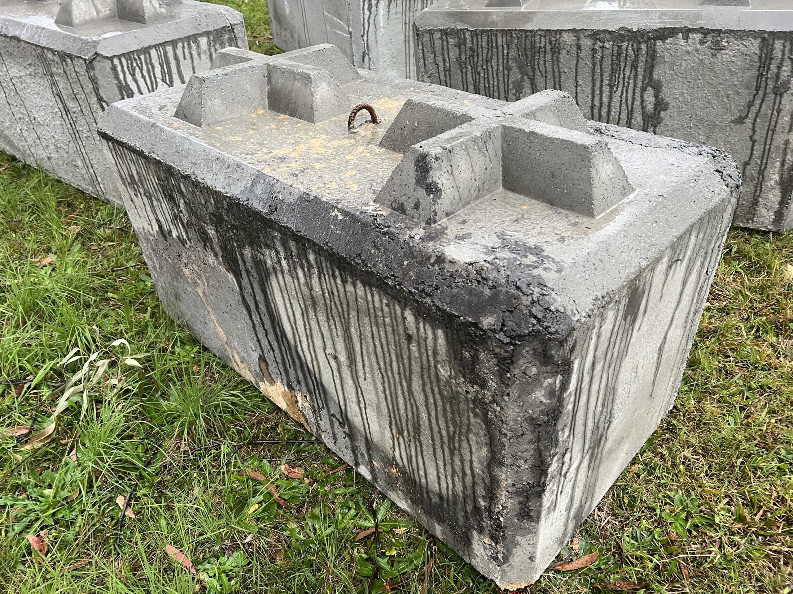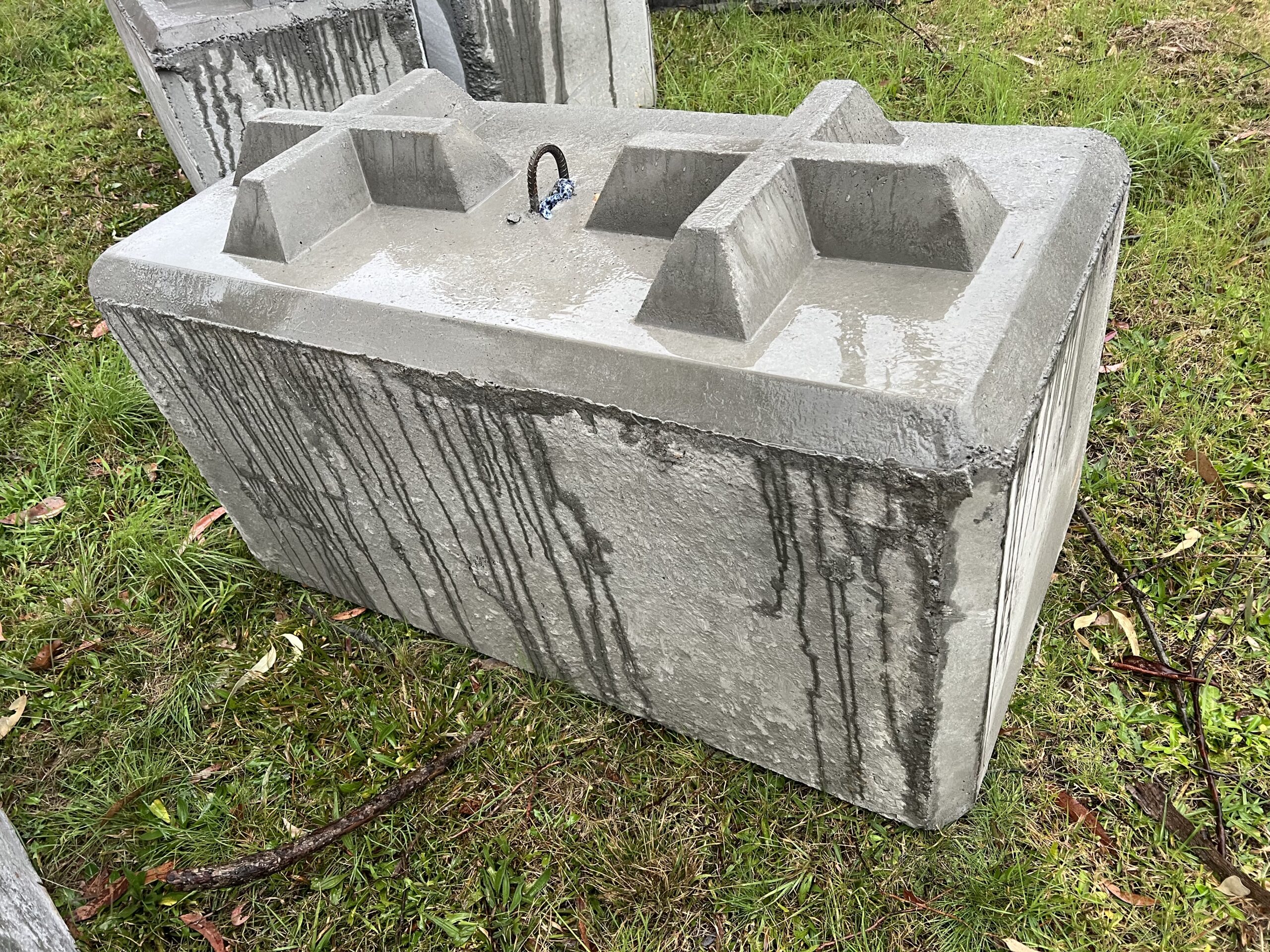 We both manufacture and on sell 1 Tonne interlocking concrete blocks. These blocks are made from left over concrete from concrete plants and as such will vary in mph, aggregate size and colour. As can be seen in the photos some blocks are made using two different pours each layer is secured to the other. We always (where feasible) recommend inspections prior to purchase as these blocks are not perfect and smooth all around and may not be suitable for areas where they will be seen due there visual appearance.